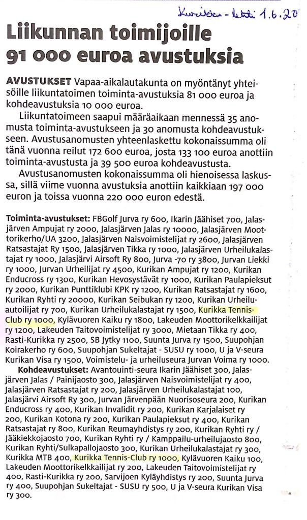 Kurikan kaupungin vapaa-aikalautakunta on myöntänyt paikallisille liikuntayhteisöille toiminta-avustuksia, joista Kurikka Tennis-Club saa toiminta-avustuksena 1000 euroa ja kohdeavustuksena niin ikään 1000 euroa.